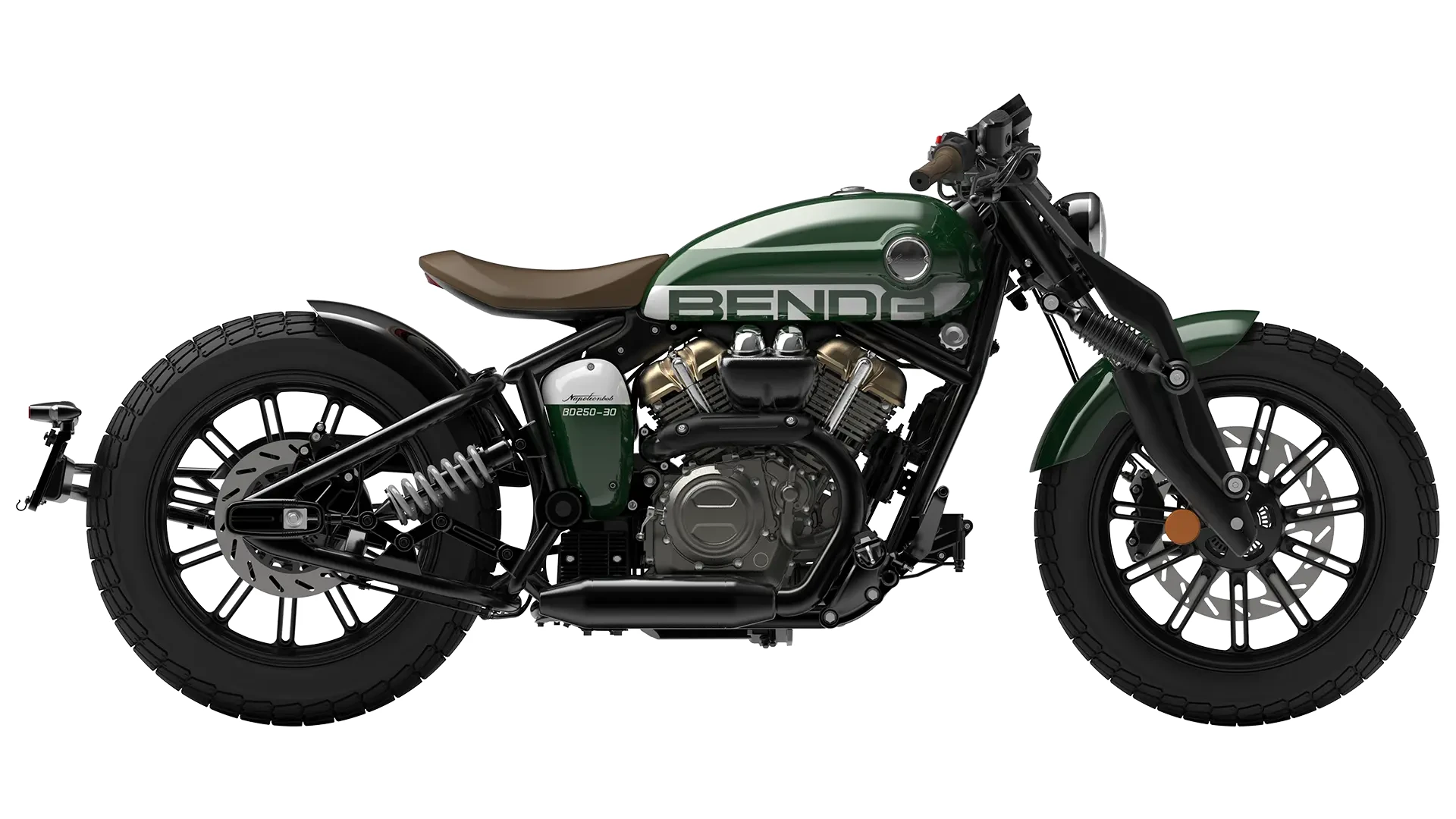 Benda Napoleonbob 125 łączy klasyczny styl z nowoczesnością oraz nutką motocykli custom. Nisko osadzone, pojedyncze siedzenie, charakterystyczny teleskopowy widelec i podwójne amortyzatory wsparte na wahaczu w stylu hardtail.